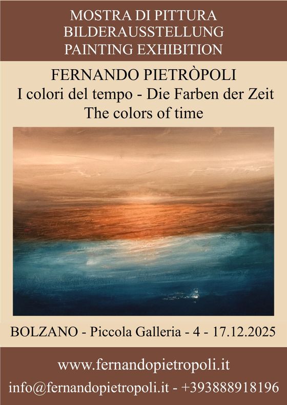Desidero invitarTi alla mostra di pittura a Bolzano, nella Piccola Galleria - Passaggio Antico Municipio 8 - angolo Via Dr.Streiter 25, aperta dal 4 al 17 dicembre. Con il titolo “I colori del tempo" presento le opere più recenti di stile lirico-astratto, informale-materico e figurativo.